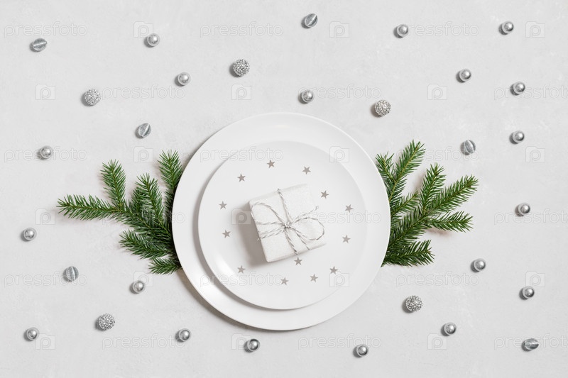 Рождественская сервировка с подарком в тарелке и серебряном декоре на белом фоне. Новогодний фон. Рождественский ужин. Вид сверху, плоская планировка
