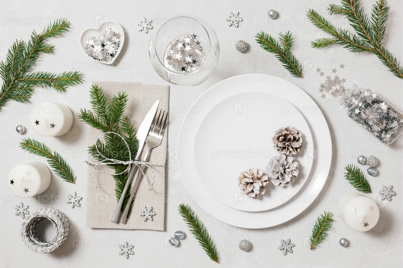 Праздничная сервировка рождественского ужина на белом фоне. Новогодняя сервировка с серебряным декором, еловыми ветками и шишками. Вид сверху