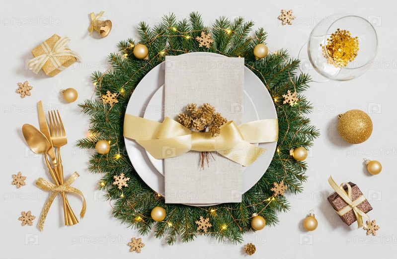 Золотая рождественская сервировка на белом фоне. Новогодняя сервировка. Рождественский ужин. Вид сверху, плоская планировка