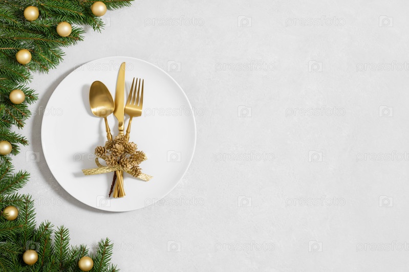 Праздничная сервировка стола с рождественским декором и посудой, золотые аксессуары на белом фоне. Подготовка к рождественскому ужину. Копирование пространства, вид сверху, плоская планировка