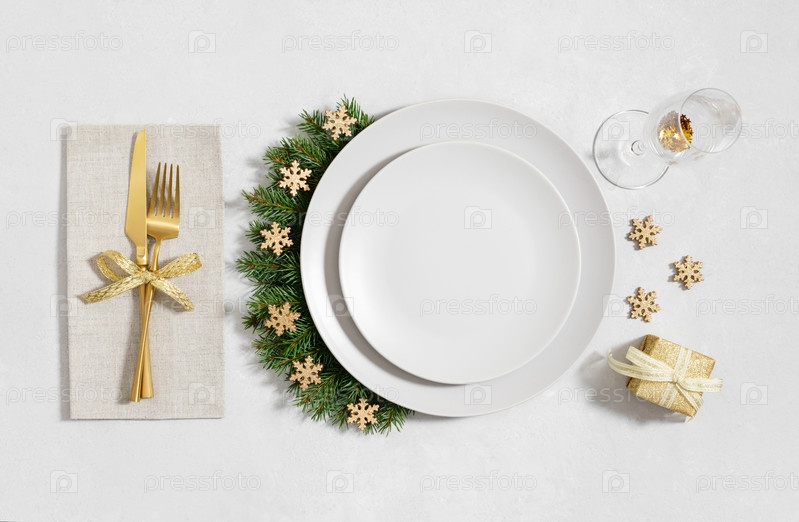 Сервировка рождественского стола с золотыми украшениями и пустой бежевой тарелкой на белом фоне. Новогодняя сервировка с пустой тарелкой для дизайна. Вид сверху, плоская планировка
