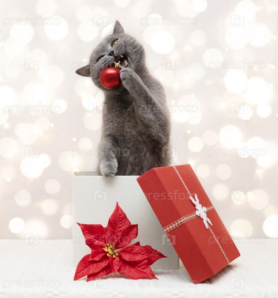 Британский кот в красной подарочной коробке играет с рождественскими украшениями. Милый кот кусает красную рождественскую безделушку на белом фоне с огнями боке. Новогодняя открытка