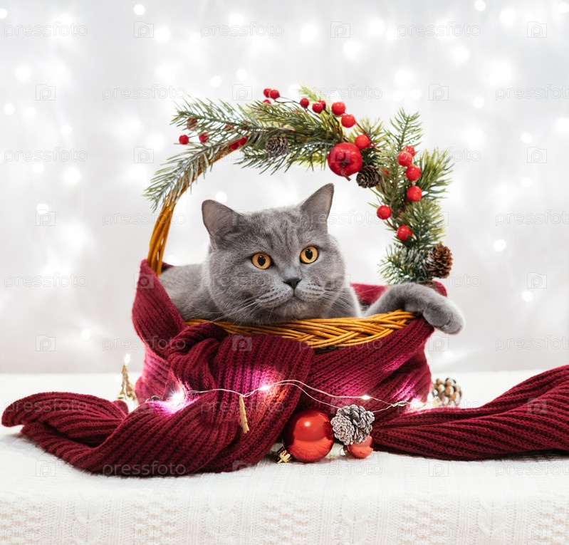 Британский кот в корзине с рождественскими украшениями на фоне огней боке. Новый год. Зимние каникулы