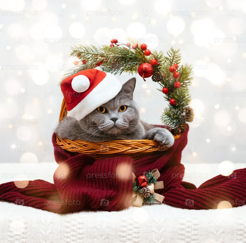 Кот в шапке Санты в рождественской корзине. Милый британский кот сидит в корзине с праздничным новогодним декором и красным вязаным шарфом. Рождественская открытка