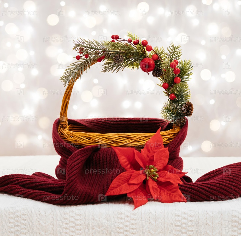 Пустая рождественская корзина с красным шарфом и праздничными украшениями. Рождественский фон для дизайна. Новогодняя композиция на ярком фоне с огнями боке