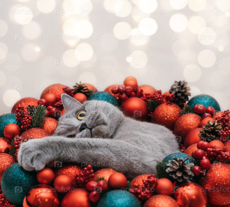 Красивая рождественская открытка с кошкой и красными праздничными украшениями. Британский кот в красных рождественских шарах на фоне огней боке с копировальным пространством