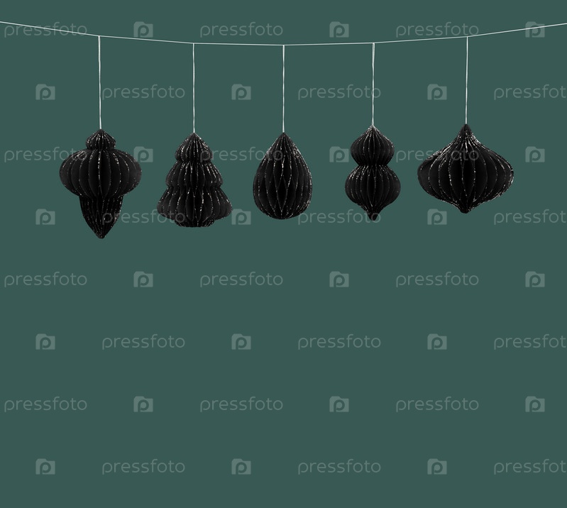 Рождественские черно-серебряные игрушки из бумаги на синем фоне. Новогодние украшения из экологических материалов. Копирование пространства