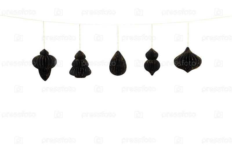 Черно-золотые бумажные рождественские игрушки изолированы на белом фоне. Новогодние украшения из бумаги. Экологичный новогодний декор. Копирование пространства