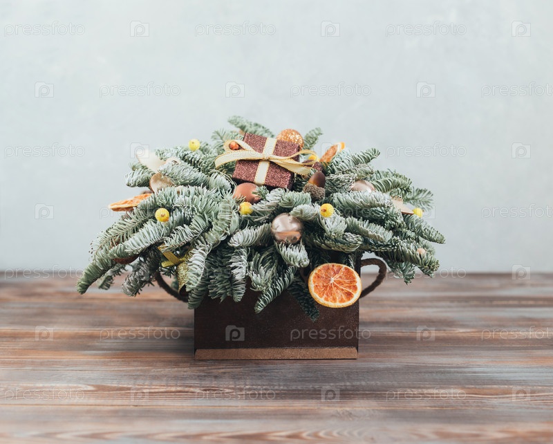 Рождественский букет. Рождественская композиция с еловыми ветками, безделушками и подарком на деревянном фоне. Новогодние украшения