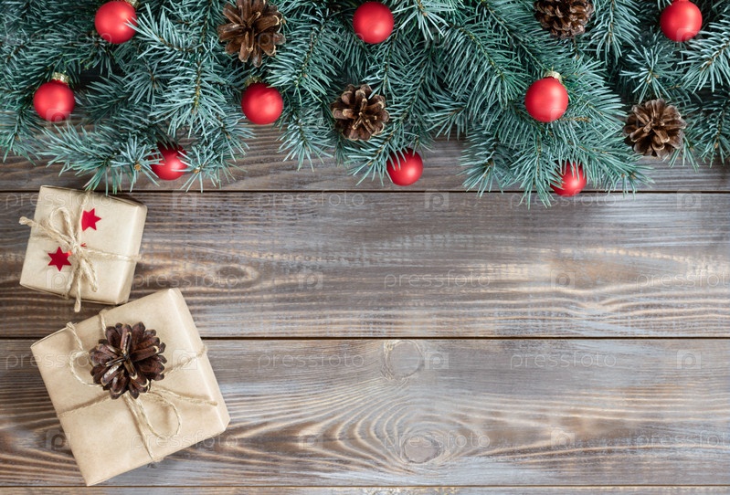 Рождественский фон с подарками, еловыми ветками, шишками и красными безделушками. Новогодняя рамка с копией пространства. Вид сверху, плоская планировка