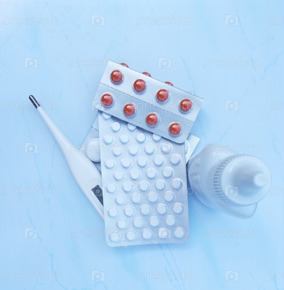 Лекарства в виде таблеток, капли для носа и градусник