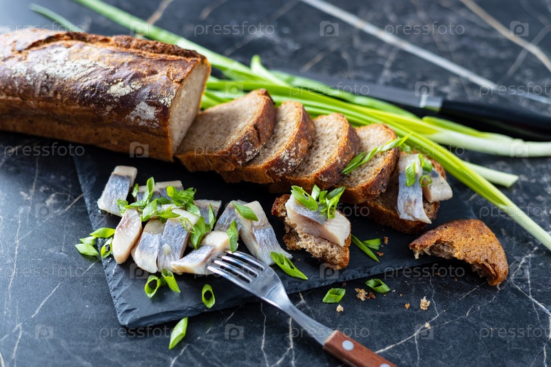 Хлеб, селедка, зеленый лук на столе