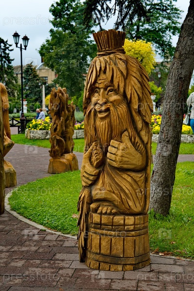 Пятигорск. Россия. Сентябрь 17, 2023. Деревянные скульптуры сказочных персонажей в городском парке Цветник