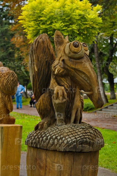 Пятигорск. Россия. Сентябрь 17, 2023. Деревянные скульптуры сказочных персонажей в городском парке Цветник