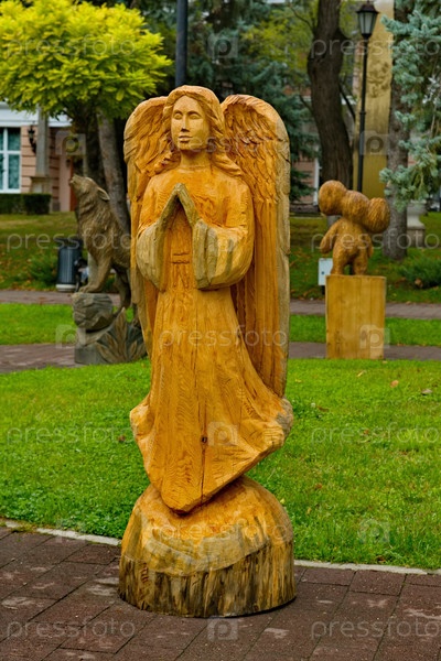 Пятигорск. Россия. Сентябрь 17, 2023. Деревянные скульптуры сказочных персонажей в городском парке Цветник