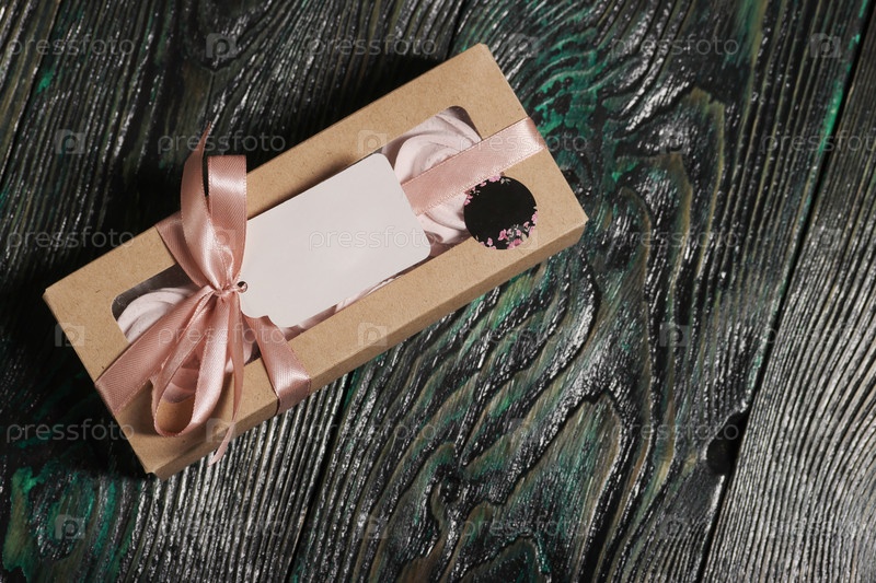 Зефирные цветы. Коробочка с домашним зефиром. Крафтовая упаковка, перевязанная скотчем. На коробке находится ярлык с полем для текста. На деревянных досках