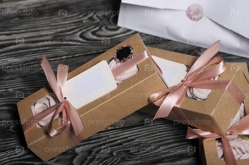 Зефирные цветы. Три коробки домашнего зефира. Крафтовая упаковка, перевязанная скотчем. На коробке находится ярлык с полем для текста. На деревянных досках