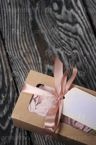 Зефирные цветы. Коробочка с домашним зефиром. Крафтовая упаковка, перевязанная лентой. На коробке имеется этикетка с текстовым полем. На черных досках. Крупный план