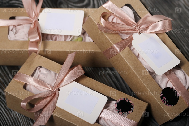 Зефирные цветы. Коробки домашнего зефира. Крафтовая упаковка, перевязанная лентой. Поля имеют метки с текстовым полем. Крупным планом, на черных досках