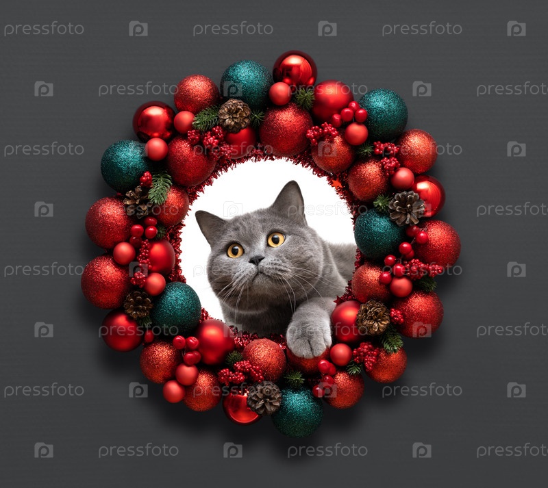 Британский кот просматривает рождественский венок из красных и зеленых безделушек на сером фоне. Концепция Нового года и Рождества
