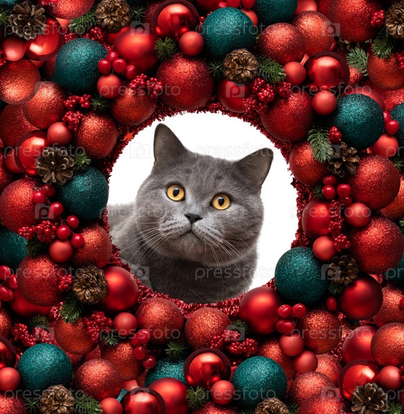Любопытный кот смотрит сквозь рождественский венок. Британский кот в рождественской рамке из красных и зеленых украшений. Новогодняя открытка