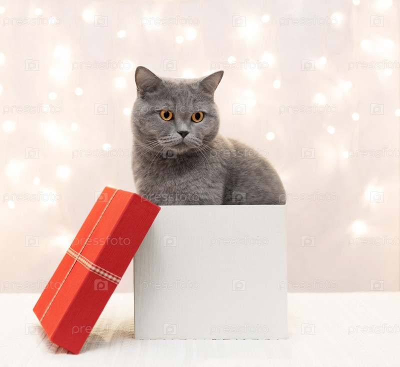 Рождественская открытка с серыми милыми котами, сидящими в подарочной коробке на фоне огней боке. Британский кот в подарочной коробке
