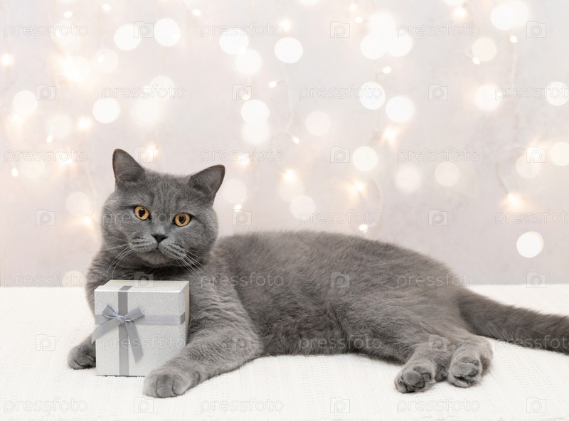 Британский кот с подарком на светлом фоне с копировальным пространством. Милый кот держит в лапах подарочную коробку. Рождественская или новогодняя открытка