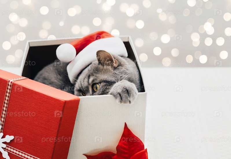 Шотландский кот в шляпе Санты прячется в рождественской подарочной коробке с местом для копирования. Новогодняя открытка с котом в подарочной коробке на светлом фоне