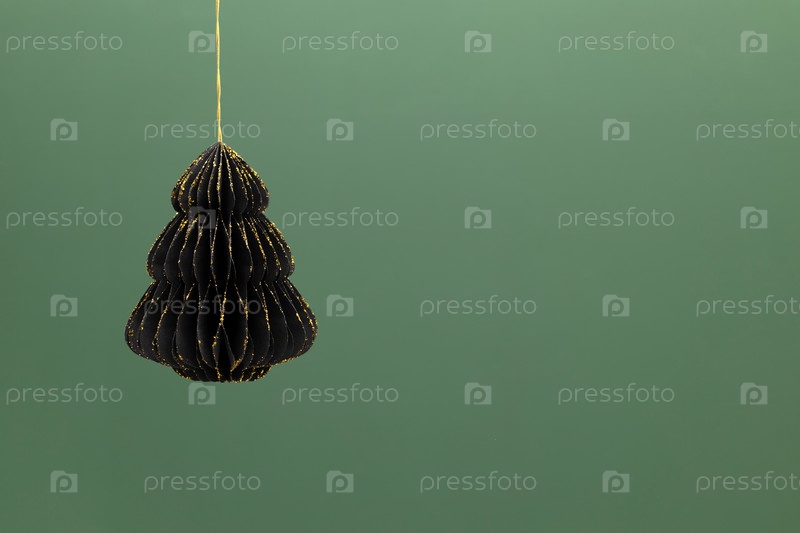 Черно-золотая бумажная елочная игрушка в форме елочки на зеленом фоне. Новогодние украшения из экологических материалов. Копирование пространства