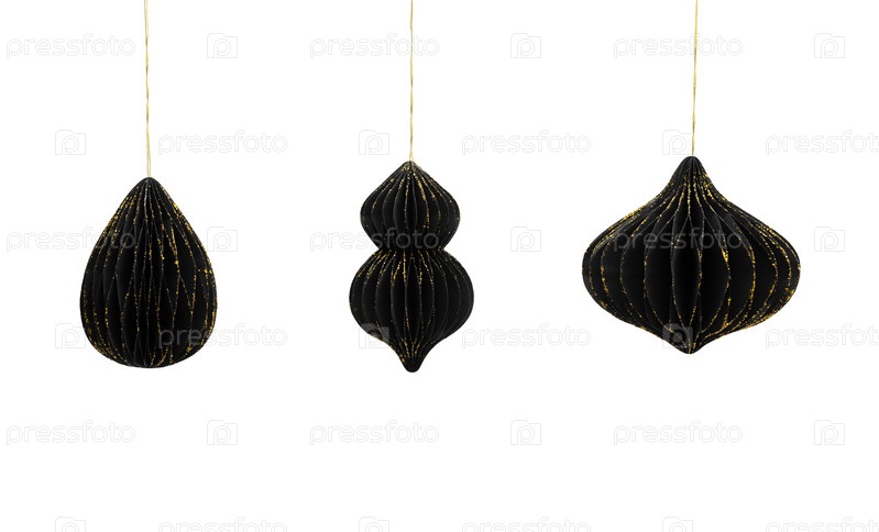 Праздничные украшения из черной бумаги изолированы на белом фоне. Новогодние игрушки из бумаги своими руками. Копирование пространства