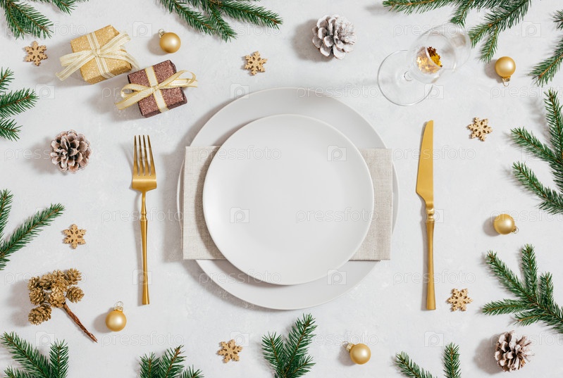 Пустая бежевая тарелка с рождественскими украшениями и еловыми ветками на белом фоне. Сервировка новогоднего стола. Вид сверху, плоская планировка