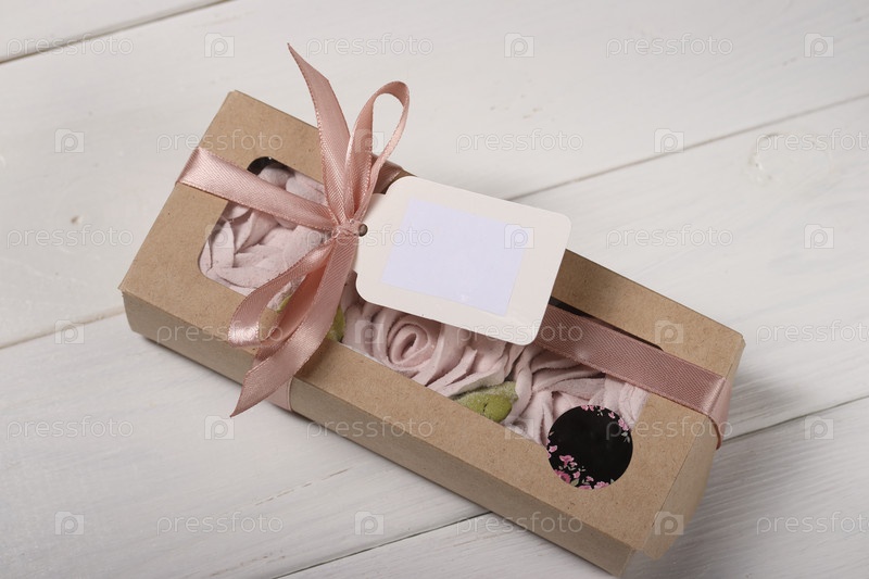 Коробочка с домашним зефиром. Зефирные цветы. Крафтовая упаковка, перевязанная лентой. Метка с текстовым полем. Крупным планом, на белых досках