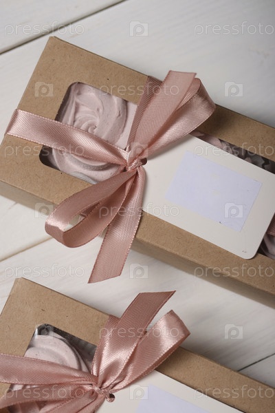 Коробочка с домашним зефиром. Зефирные цветы. Крафтовая упаковка, перевязанная лентой. Метка с текстовым полем. Крупный план