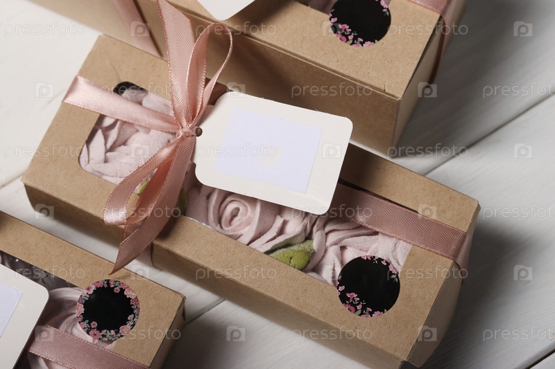 Коробки домашнего зефира. Зефирные цветы. Крафтовая упаковка, перевязанная лентой. Этикетки с текстовым полем. Выстрел сверху