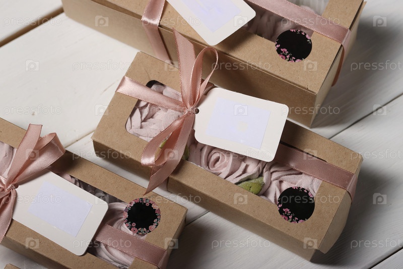 Три коробки домашнего зефира. Зефирные цветы. Крафтовая упаковка, перевязанная лентой. Этикетки с текстовым полем. Выстрел сверху