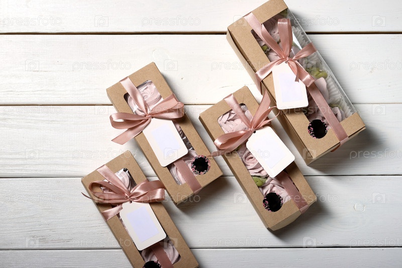 Четыре коробки домашнего зефира. Зефирные цветы. Крафтовая упаковка, перевязанная лентой. Метка с текстовым полем. Выстрел сверху