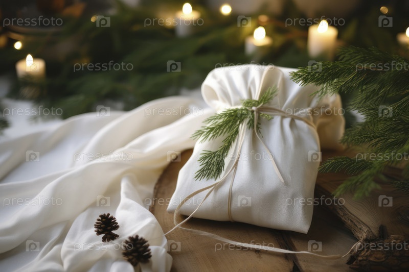 Рождественский подарок. Упаковка из экологически чистых материалов, ткань фурошики. Боке, выборочный фокус