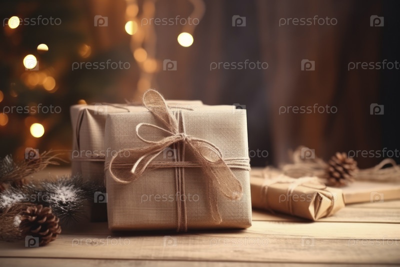 Рождественский подарок. Упаковка из экологически чистых материалов, ткань фурошики. Боке, выборочный фокус
