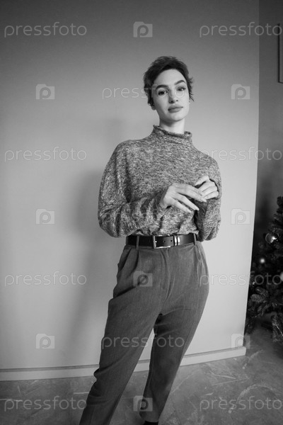 Молодая красивая женщина позирует в свитере в студии, черно-белое фото, с короткой прической