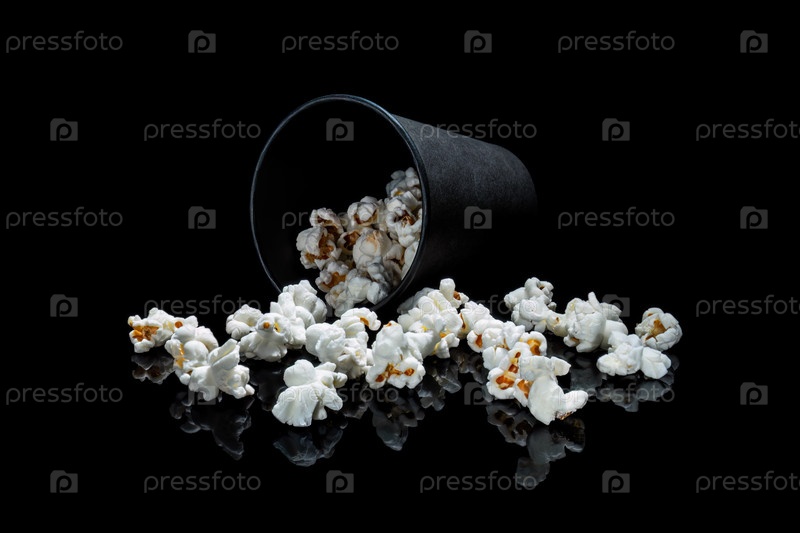 Черный бумажный стаканчик с пролитым попкорном, лежащий на боку на черном фоне с отражением. Крупный план. Селективный фокус. Горизонтальный