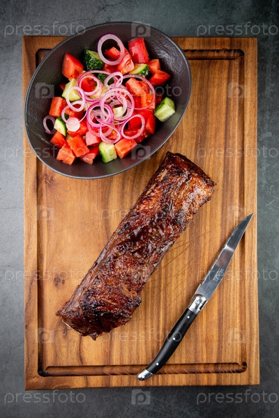 Говяжьи ребрышки в соусе барбекю с салатом из свежих овощей, вид сбоку