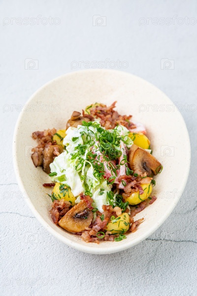 Салат с картофелем, рисом, мясом и зеленым луком, вид сверху