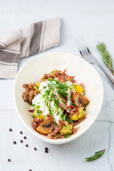 Салат с картофелем, рисом, мясом и зеленым луком, вид сверху