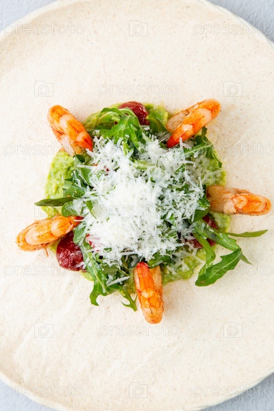 Красиво поданные креветки с рукколой и тертым сыром, вид сбоку