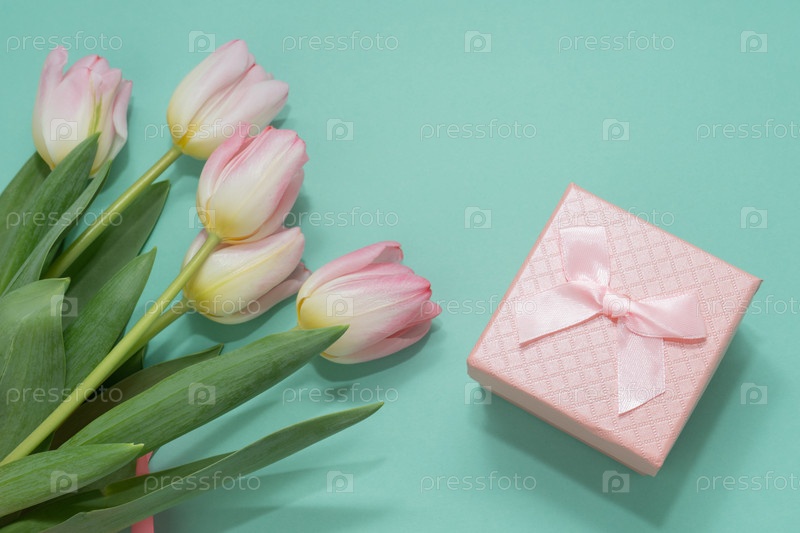 Розовая подарочная коробка и букет розовых тюльпанов