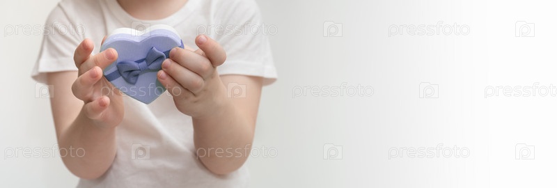Ребенок держит в руках подарочную коробку в форме сердца. День матери