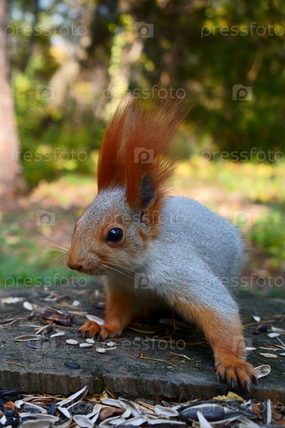 Белка сидит на деревянном пне с семенами. Осенний лес. Вид сбоку
