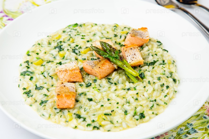 Рисовая каша с артишоками, красной рыбой и зеленью в белой тарелке, вид сбоку