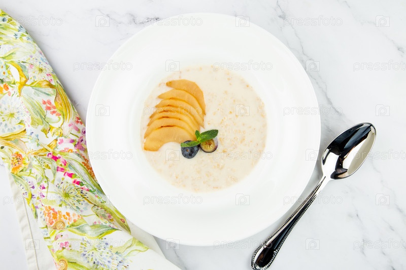 Здоровый завтрак с фруктами на белой тарелке, вид сбоку