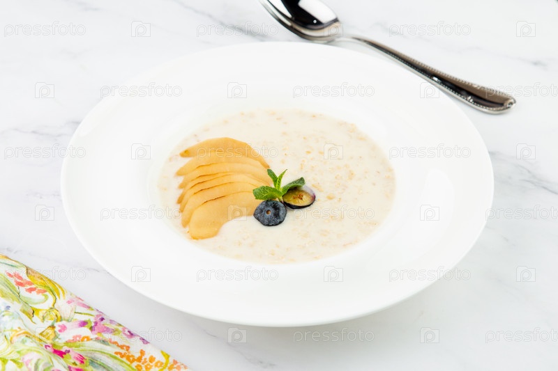 Здоровый завтрак с фруктами на белой тарелке, вид сбоку